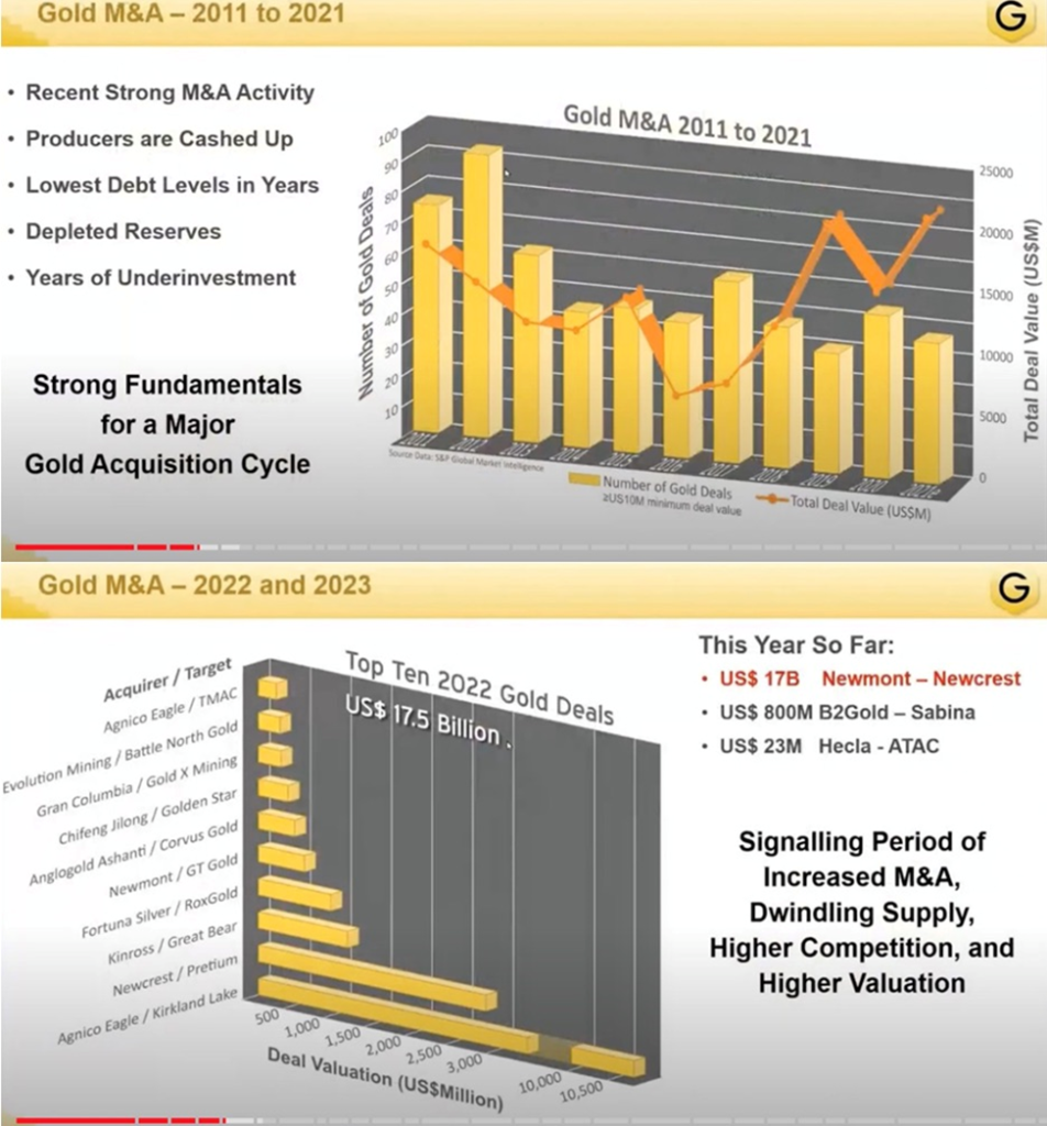 The slide below shows that starting in 2019, there has been a major uptick in gold M&A, with a large number of transactions as well as the total dollar value of the deals. In 2022, the top 10 gold deals equated to $17.5 billion, topping a record set in 2021. So far in 2023, the industry has seen close to $18B in acquisition offers, the most prominent being Newmont’s offer to buy Newcrest.