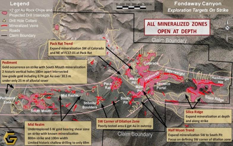 The Central Target Area is a 1,000 x 700-meter highly mineralized NE-SW extensional zone within the 3.5-km east-west trending Fondaway Canyon gold trend. According to Getchell, the Central Target Area is a nexus for the extensive gold emplacement mineralizing system observed at the project. Gold mineralization has been traced from surface to greater than 300m below surface at certain locales and remains open in all directions. Five of the six drill holes will be collared within this Central Target Area and will focus on the Half Moon – South Pit and the Colorado – Pack Rat mineralized corridors.