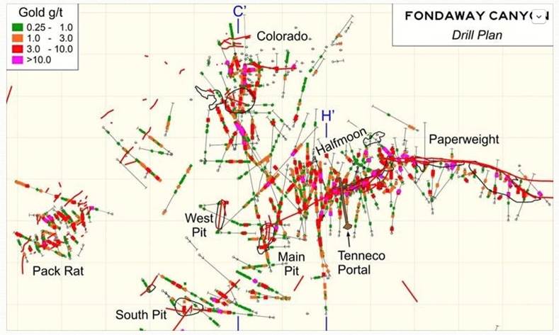 Fondaway Canyon West Area Plan Map showing main shear veins, drill traces and gold intercepts