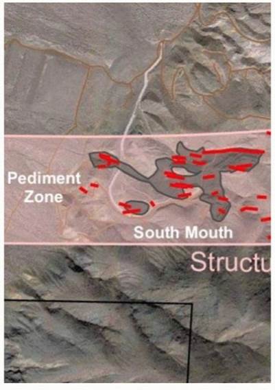 However the most intriguing option to us at AOTH, and what could be underpinning the entire structurally-controlled gold zone all the way to Hamburger Hill, is the Pediment zone, appearing at the (enlarged) left edge of the map below.