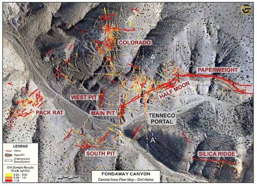 Fondaway Canyon Central Area Plan Map showing main shear veins, drill traces and gold intercepts