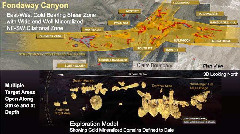 The company views the Pediment Zone as a stand-alone target with potential similarities to the world-famous Carlin-style gold system in Nevada, which is noted for its “disseminated” (fine-grained) nature. As such, additional work on the Fondaway veins is warranted.