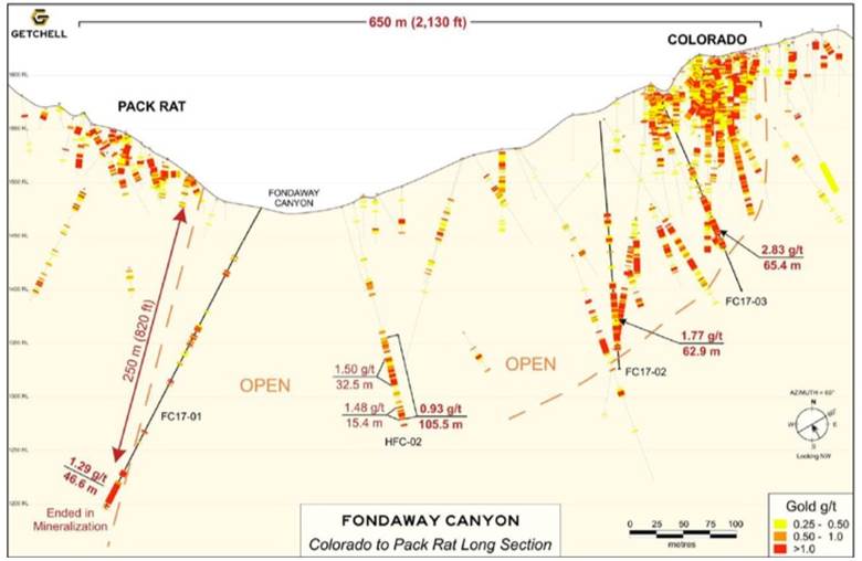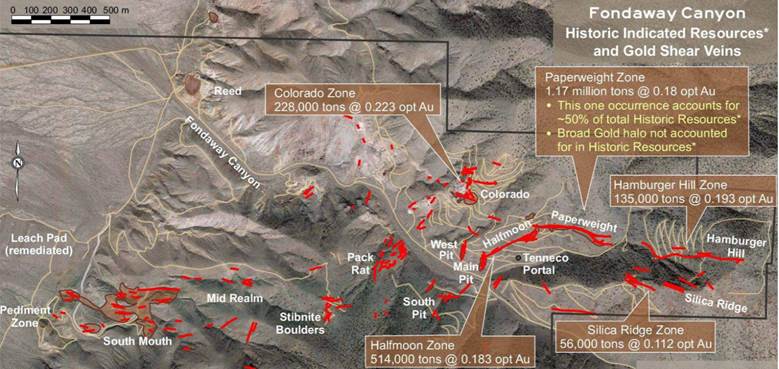 Key to the exploration strategy at Fondaway is the Central Area, detailed on the first map below. Substantial gold mineralization is evident near surface, within a 650-meter-long structurally controlled gold zone, as seen at the Colorado and Pack Rat zones on the second map. 2017 drill holes indicated the mineralization extends to depth. A similar set-up appears in the Paperweight to South Pit zones.