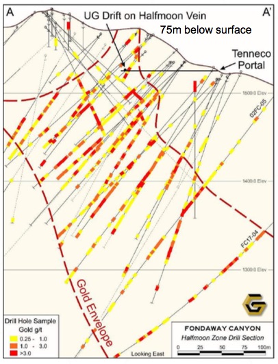 In 1989, Tenneco Minerals completed 165 meters of underground development (adit and drift) to bulk sample the high-grade Half Moon shear vein, a prominent quartz-rich shear zone within the Central Area. Highlights from channel sampling of the drift face included 24.1 grams per tonne Au over 1.8m and 21.8 g/t Au over 1.5m.