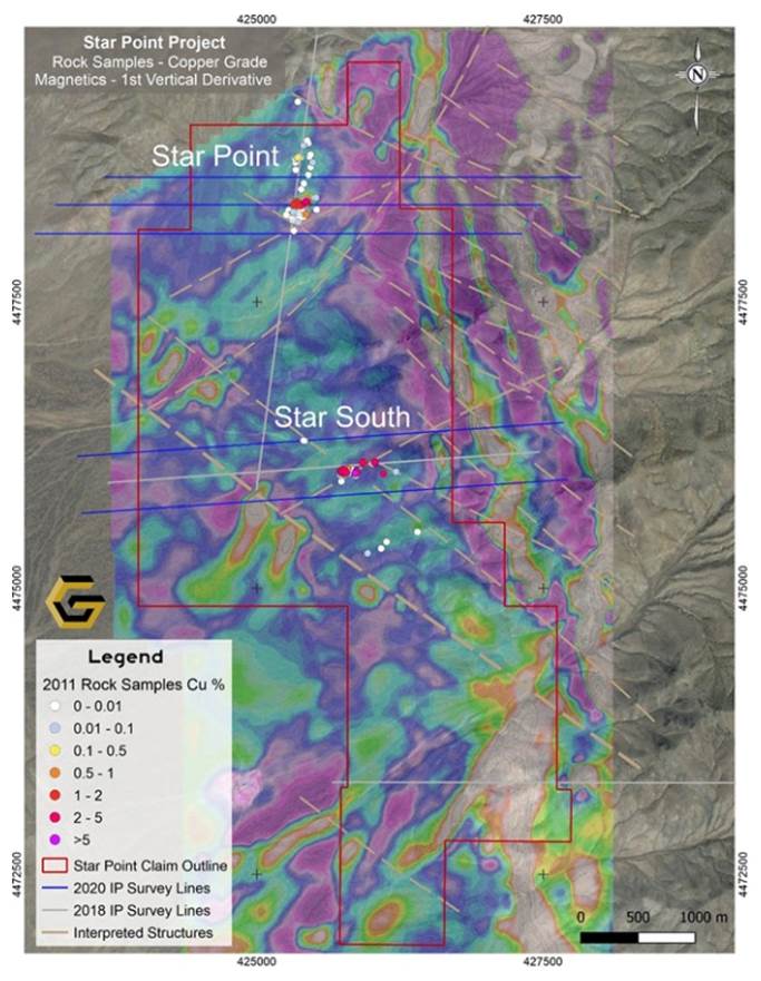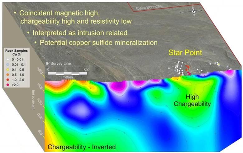 Fast forward to 2018, when a magnetic geophysical survey and a limited (one line) IP survey was conducted over the Star Point area. This revealed that the surface mineralized expression at Star Point is underlain by coincident magnetic high-, chargeability high- and resistivity-low anomalies that are interpreted as potential copper sulfide mineralization, possibly intrusion-related. They present a compelling drill target for the company.