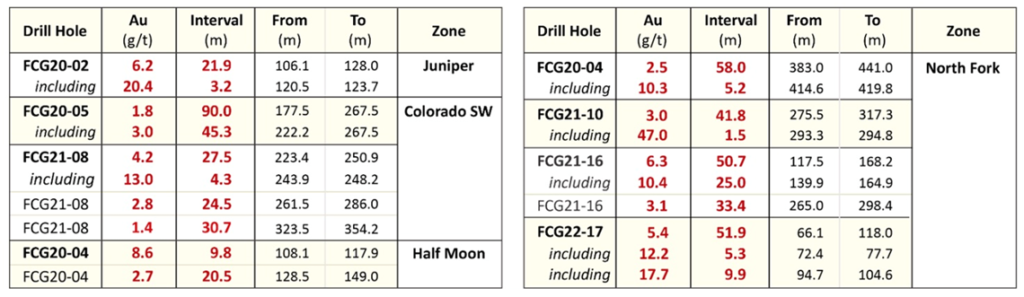 The first hole of the 2022 program, FCG22-17, was collared on the canyon floor on the same drill pad as hole FCG21-16. It was designed as a 25-meter step-out to the northwest, from the high-grade intercept encountered in FCG21-16. More follow-up drill holes are planned to bracket and expand upon the North Fork Zone mineralization.