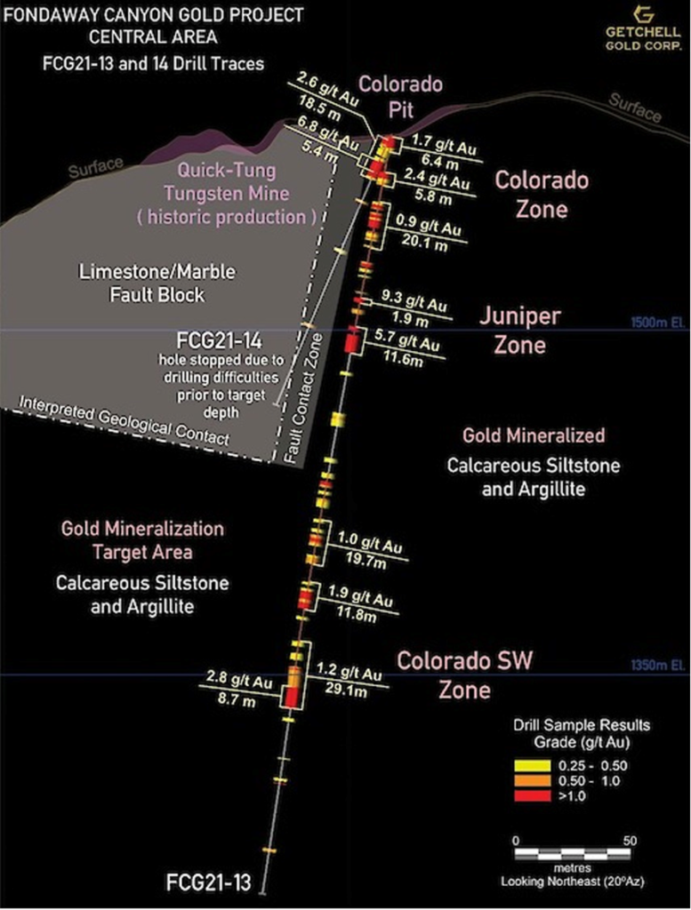“In combination, holes FCG21-13 and FCG21-14 demonstrate that the gold mineralization envelope extends down to a depth of 250 metres starting right below our feet at the Colorado Pit and they reinforce the upside potential scale of the mineralizing system at Fondaway Canyon,” Sieb stated in the Jan. 25 news release. “In addition, FCG21-14 tested the contact relationship of the gold mineralization with a local block fault marble unit providing valuable information to assist with resource modelling and with planning future drill holes in the area to target the extension of the gold mineralization.”