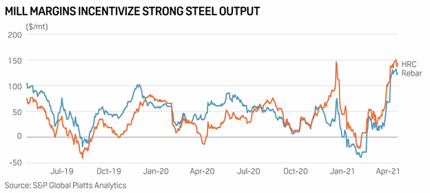 According to S&P Global Platts, China’s domestic hot-rolled coil prices have risen around 12% since early March, reaching their highest level since mid-2008.