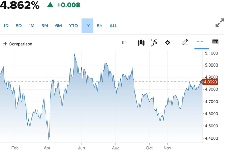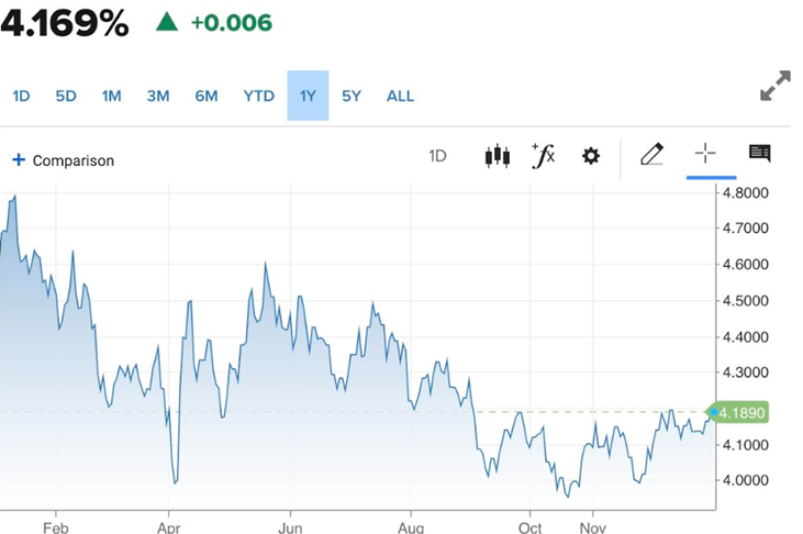 Powell recently stated there is nothing to suggest concern about inflation in the long-term, so why are rates going up? As the two charts below show, the 10-year yield has risen from 3.99% on Nov. 26, 2025, to the current 4.16%, a gain of 0.17%, while the 30-year yield has gained 0.22% over the same period.