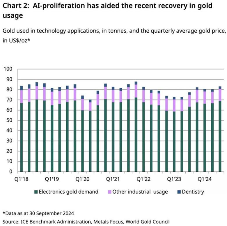 Gold is obviously seen as less of an industrial metal than silver, but new uses are coming to the fore. In particular, gold is finding applications in AI-related technology.