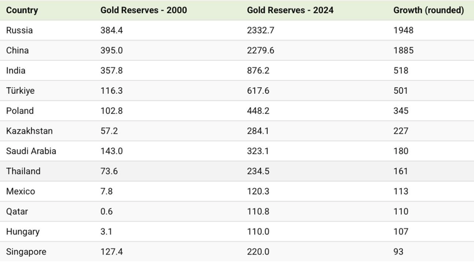 The chart, which visualizes the net additions to official gold reserves from 2000 to 2024, reveals that Russia narrowly edged out China with a 1,984-tonne increase compared to China’s 1,885 tonnes.