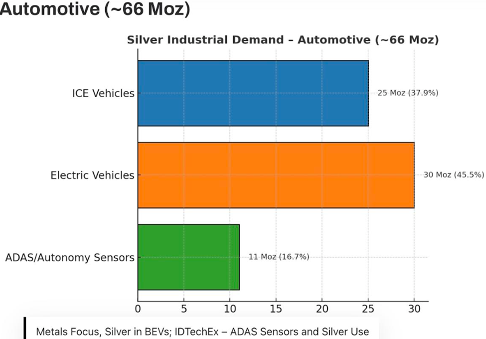A Silver Institute report says battery electric vehicles contain up to twice as much silver as ICE-powered vehicles — between 20 and 50 grams depending on the model. Charging points and charging stations are also expected to demand a lot more silver. It estimates the sector’s demand for silver will rise to 88Moz in five years as the transition from traditional cars and trucks to EVs accelerates. Others estimate that by 2040, electric vehicles could demand nearly half of annual silver supply.