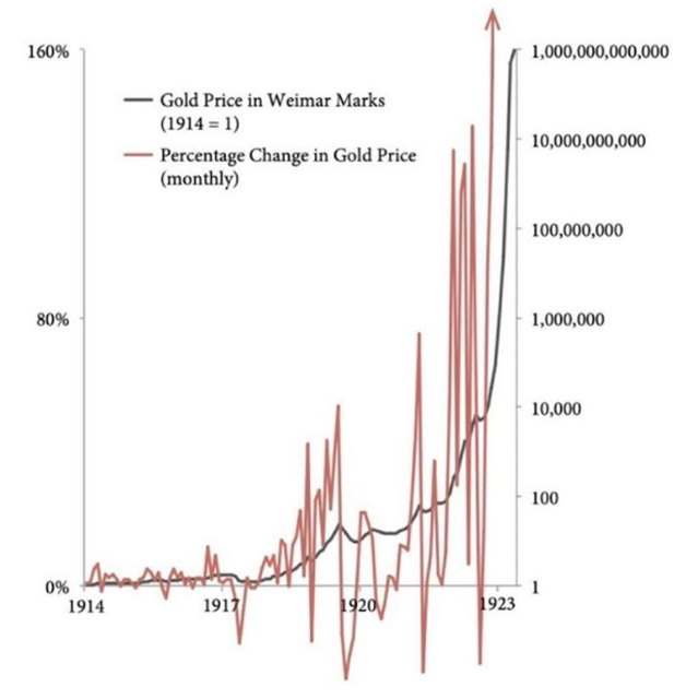 Commentators mostly talk about the dollar, interest rates, and bond yields in the context of gold, but Tavi Costa, former partner at Crescat Capital, recently chose to comment on silver — although the chart he posts shows how the price of gold spiked during the hyperinflationary years of Germany’s Weimar Republic.