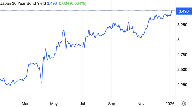 Japan’s 30-year bond yield currently sits at 3.4% compared to 2.2% a year ago.