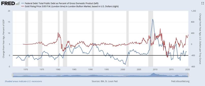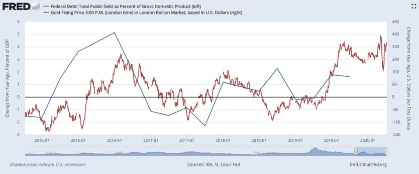 By now we hope you are beginning to notice the same trend we are: as the debt-to-GDP-ratio rises, either because of a drop in GDP due to a recession, or a jump in government borrowing that piles up debt, or both, the gold price reacts.