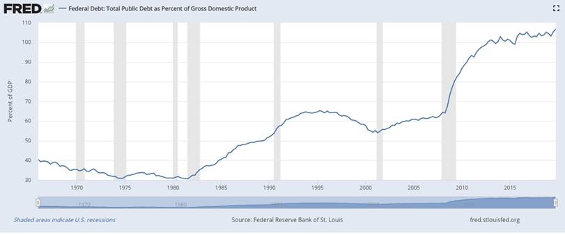 We see the red line in the first chart spike above $400/oz, within a couple of years of the blue line, the US debt-to-GDP ratio, in 2009 reaching a 50-year high of 15% change in debt-to-GDP ratio. The same pattern shows up in the second and third charts, where the debt soars to between 100 and 110% of GDP between 2012 and 2019 (2020 is not yet reflected in the first two charts) and the gold price rockets from about $800 an ounce in 2008 to an all-time high of $1,900/oz in 2011.