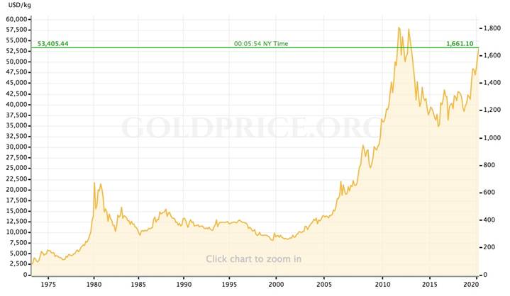 Meanwhile gold’s red line which shows volatility at the far right side of the chart, reflected in the stock market convulsions in February-March owing to the pandemic, could very well begin a steadily upward trend, similar to what happened in 2008-11, possibly meeting and beating gold’s record $1,900/oz.