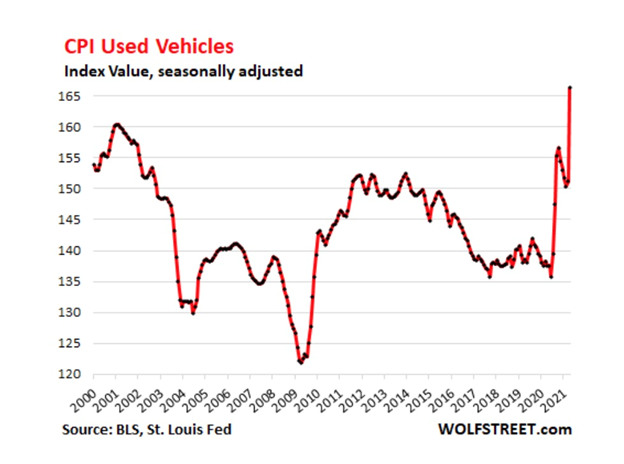 [A]s you can see from the astonishing fact that the index in 2020 was below where it had been 20 years earlier, even though actual prices of used vehicles have soared over those 20 years. It took this massive spike in April to put the index above where it had been in the year 2000.
