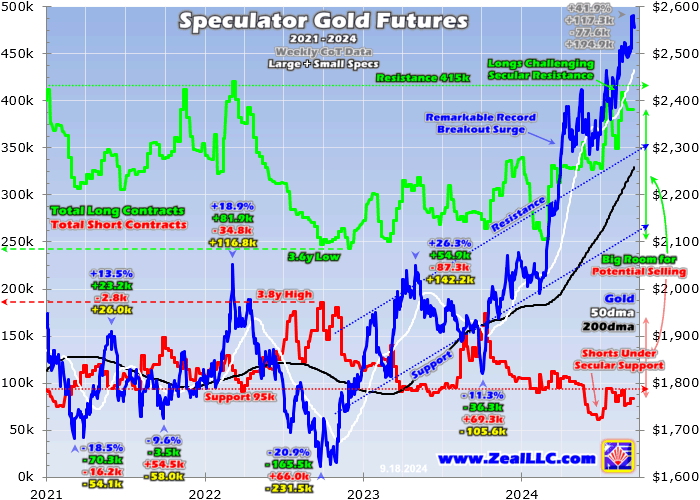 Spec longs really outnumber shorts, averaging 3.4x higher over the past 52 CoT weeks. That makes longs proportionally more important than shorts for near-term gold-price direction. Those were way up at 390.9k in that latest-reported CoT eight days before the FOMC meeting. And odds are they surged much higher by FOMC eve, probably exceeding their 415k resistance when that 50bp cut and super-dovish dots hit!
