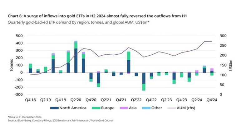 Last year’s investment demand for gold rose 25% to a four-year high of 1,180 tons, mainly because outflows from physically-backed gold exchange-traded funds (ETFs) dried up for the first time in four years…