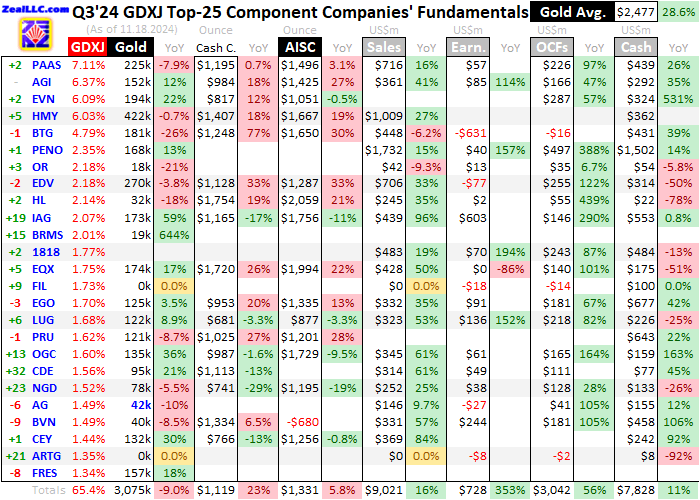 This table summarizes the GDXJ top 25’s operational and financial highlights during Q3’24. These gold miners’ stock symbols aren’t all US listings, and are preceded by their rankings changes within GDXJ over this past year. The shuffling in their ETF weightings reflects shifting market caps, which reveal both outperformers and underperformers since Q3’23. Those symbols are followed by their recent GDXJ weightings.