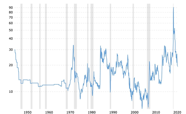 The chart below shows the historical ratio between the gold price and West Texas Intermediate (WTI) crude. Simply put, the gold-oil ratio is how many barrels of oil can be bought with an ounce of gold.