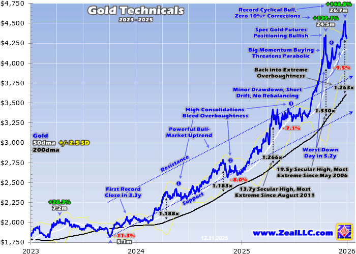 Gold soared in 2025 achieving one of its most-phenomenal years ever, smashing countless records. Such epic performance naturally earned gold universal adoration, and fueled intense herd greed. That combined with extremely-stretched technicals leaves gold vulnerable to some kind of reckoning early in this new year. That should prove a big-and-fast drawdown, though gold could get lucky and consolidate high again.
