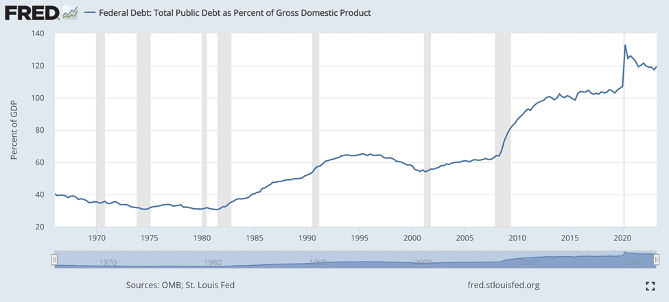 Point one: rates have been at 5% before but never with $33 trillion in debt outstanding. The chart below of US debt-to-GDP shows the ratio at around 130%.