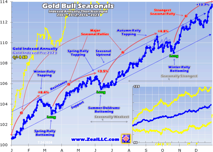 Prevailing gold prices varied radically across these secular spans, running just $257 when gold’s epic 2000s bull was born to July 2024’s latest record high of $2,465. That vast range of gold levels spread over all those long years has to first be rendered in like-percentage terms in order to make them perfectly comparable with each other. Then they can be averaged together to distill out gold’s bull-market seasonality.