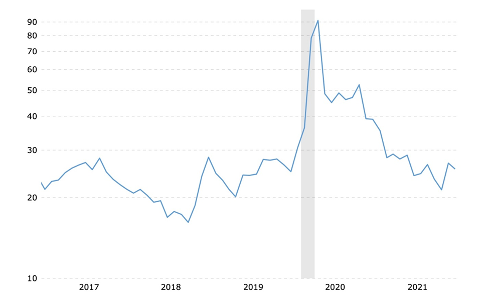 Earlier on we discussed the gold to oil ratio, finding that while the ratio hit a record 91 in April 2020, it has since fallen to about 25, due mostly to the phenomenal rise in oil prices built on the economic recovery from the pandemic.