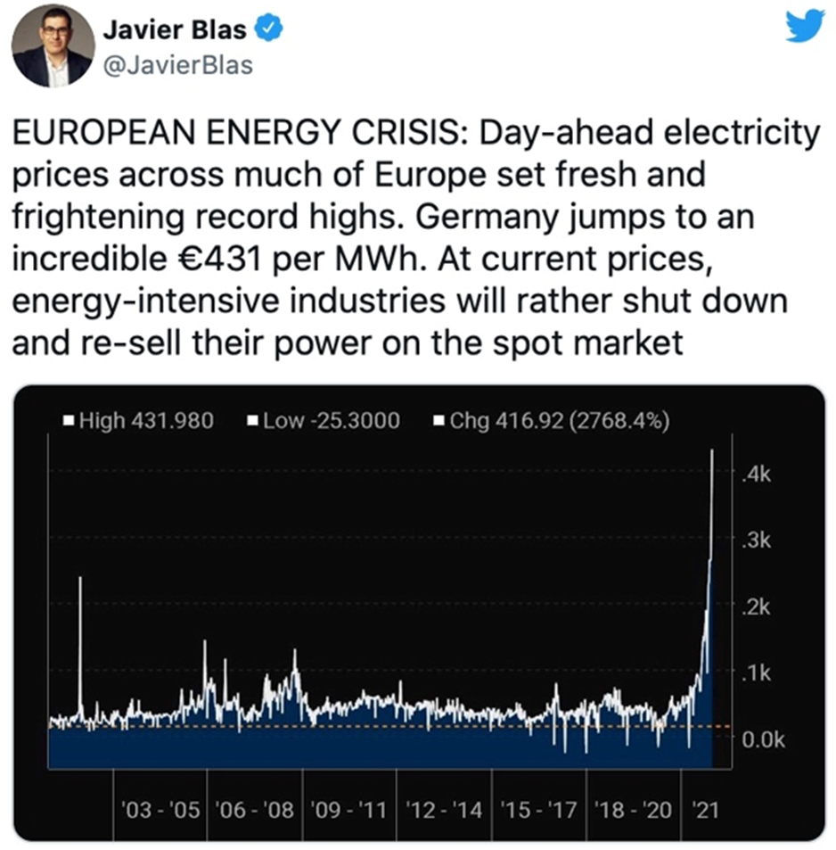 Zero Hedge reports benchmark natural gas prices surged to a new high last week. German “day-ahead” electricity prices are at a record-high 431 euros per megawatt hour, while in France, power prices are at decade highs.