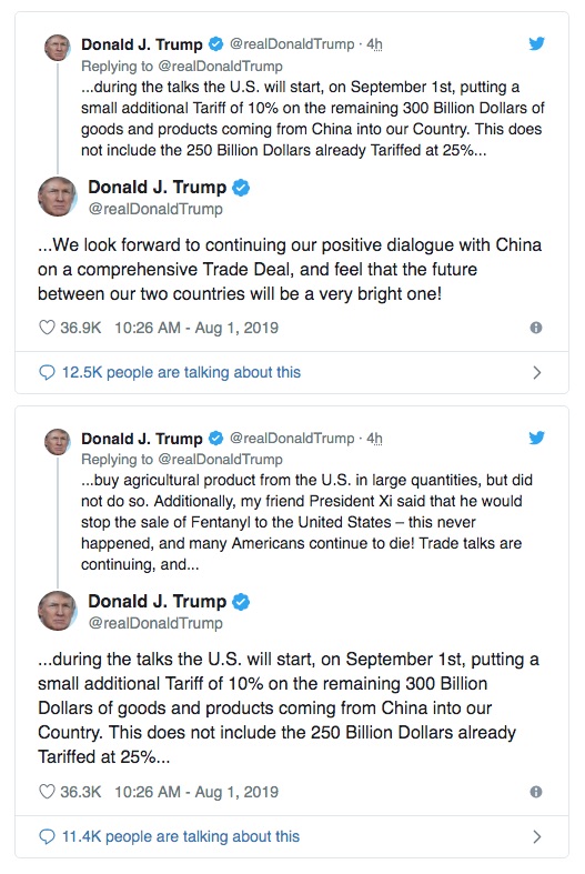 Was it a coincidence that Trump ordered 10% tariffs on $300 billion worth of Chinese imports, the day after the US Federal Reserve didn’t give him what he wanted, a 50-point rate cut? We think not!