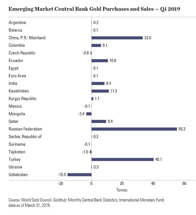 Recall from the World Gold Council report, emerging-market countries represented 93% of the 145.5 tonnes of gold purchased in the first quarter of 2019.