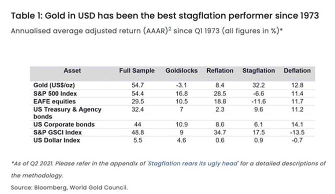 In fact, gold outperforms other asset classes during times of economic stagnation and higher prices. The table below shows that, of the four business cycle phases since 1973, stagflation is the most supportive of gold, and the worst for stocks, whose investors get squeezed by rising costs and falling revenues. Gold returned 32.2% during stagflation compared to 9.6% for US Treasury bonds and -11.6% for equities.