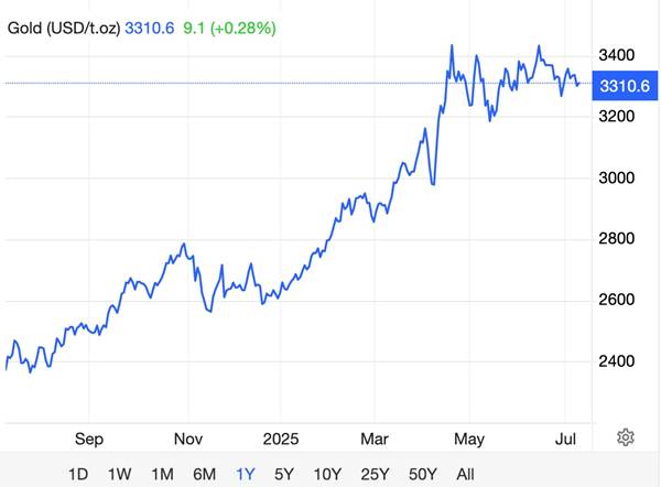 Plus, this old chestnut: Since the US dollar was taken off the gold standard in 1971, the USD has lost 99% of its purchasing power. Gold, meanwhile, has risen from $41 an ounce in August 1971, to its current $3,294, a gain of 8,034%.