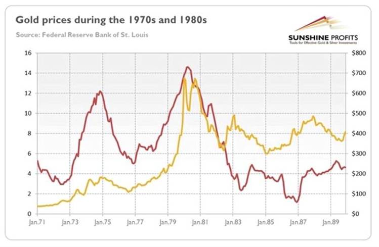 The chart below by Sunshine Profits shows the gold price climbing during the stagflationary 1970s, surging from $100 per ounce in 1976 to around $650 in 1980, when CPI inflation topped out at 14%.