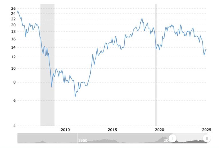 The Dow is currently trading at 44,240 and the gold price is $3,330, so the Dow to gold ratio is 13.5. The lower the ratio goes, the worse it is for stocks, and the better it is for gold.
