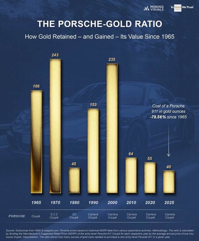 The Porsche 911 sports car has seen massive deflation so far in this century when priced in gold, as the metal has risen faster than the car’s sticker price. Whereas a 1965 Porsche Coupe cost 186 ounces of gold to buy, a 2025 Porsche 911 only costs 40 ounces — a decline in gold ounces of 78.56%.