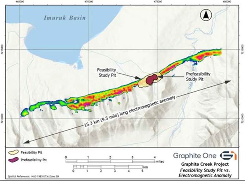 The graphite zone is exposed on the surface and strikes east/northeast along the north face of the Kigluaik Mountains. The FS pit and Mineral Reserve and resources footprint represents just 1.9 km of the 15.3-km-long electromagnetic anomaly (Figure 1).