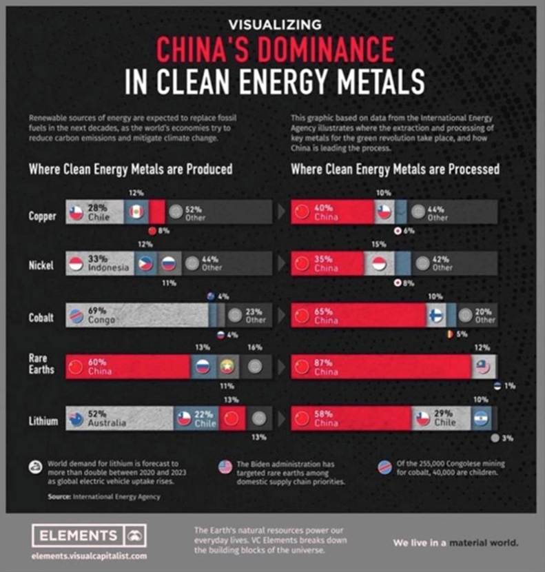 China has a stranglehold on processing critical minerals, meaning it can weaponize them during conflicts with its adversaries, as it has done before with Japan (rare earths), and the United States with export controls on gallium, germanium, graphite, antimony. In December 2023 China banned the export of technology to make rare earth magnets.
