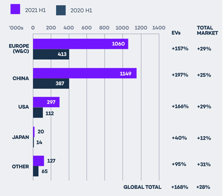 Power Technology, known for its research on the energy sector, reports that EV sales more than doubled in the first half of 2021, increasing by 160% compared to H1 2020. The 2.6 million units sold, 1.1 million of which were in China, represent 26% of total new car and truck sales globally.