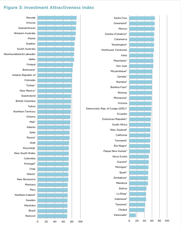 In terms of mining investment attractiveness, the DRC ranks far down the list of countries considered the best places for mining companies to do business, according to the latest (2020) Fraser Institute rankings.