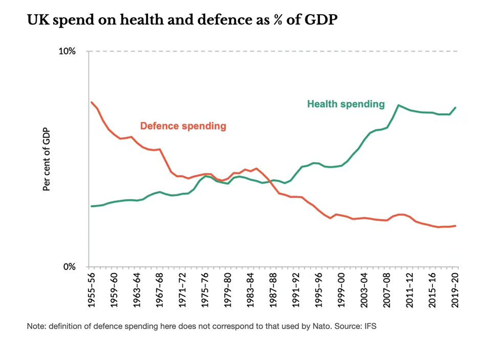 The “peace dividend” from lower spending on defence over the past several years has allowed successive UK governments to pay for a growing welfare state. The country now spends a little over 2% of GDP annually on defense, but it wasn’t always this small. In the mid-1950s the UK spent 8%, falling to about 4% in 1980 and 3% in 1990. In comparison, government spending on the National Health Service rose from around 3% of GDP in the mid-1950s to over 7% by 2020.