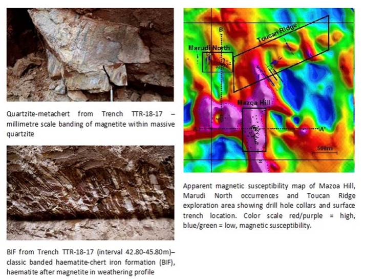 The airborne geophysical survey also found new targets along strike and deeper than the known mineralization at Mazoa Hill and Marudi North, under the trenched areas along Toucan Ridge, and at several magnetic anomalies found throughout the property.