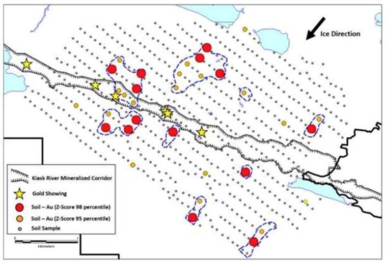Results from the soil geochemical program highlight distinctive gold targets. HVG had a greater than 98th percentile gold Z score; the extremely high values are clearly defining eight zones in and parallel to the KRMC.