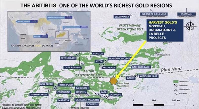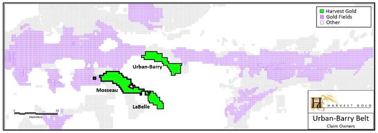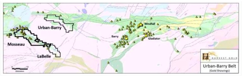 The Abitibi is a geological formation dominated by Gold Fields (NYSE:GFI). Harvest Gold controls three large prospective land packages (Urban Barry, Mosseau and La Belle) all overlaying the same geological contact within the Urban Barry Greenstone Belt.
