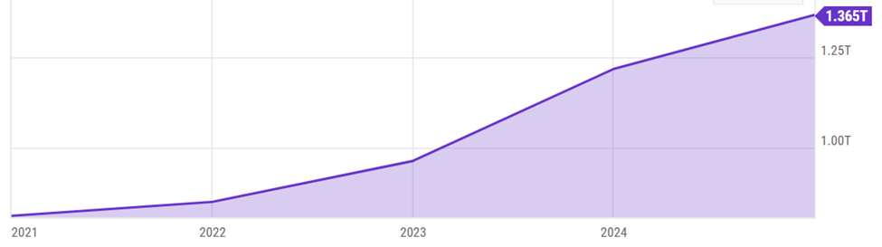 The greenback share of global reserves declined to 58% in ’24, 20 years ago it was over 70%. There are new payment systems that aren’t involving US banks, and commodity transactions are increasingly priced in non-US dollar currencies.