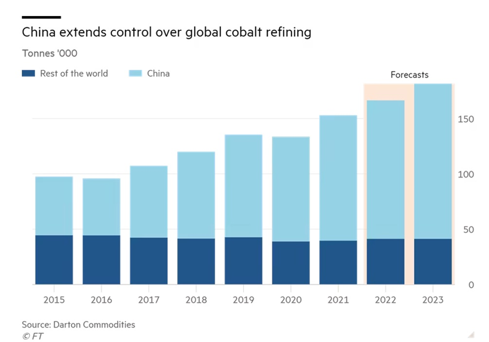 It also has a tight grip over the world’s supply of cobalt through its mining operations in the Democratic Republic of the Congo. Over the next two years, China’s share of cobalt production is expected to reach half of global output, up from 44% at present, according to UK-based cobalt trader Darton Commodities.
