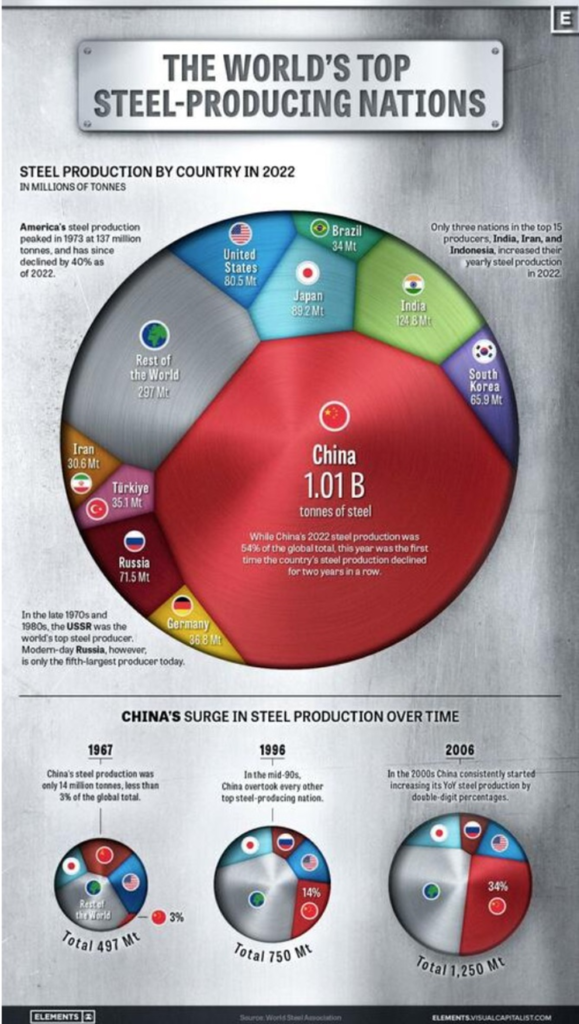 What accounts for China’s success in steelmaking? According to Forbes, the Chinese since the mid-2010s have been flooding the global market with steel that is 20 to 50% cheaper than its competitors. Cheap Chinese steel led to the US-China trade war in 2016, which imposed tariffs on steel and aluminum shipped from China and other countries. India and Britain also imposed steel tariffs on China.