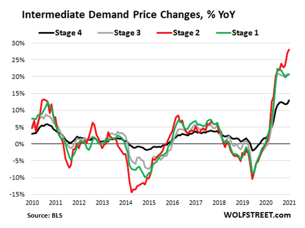 Wolf Street puts more meat on the bones of this statistic, calculating PPI at the various points good are produced. The graph below shows red-hot price increase in the four stages of Intermediate Demand are getting passed onto the next industry in line, and price increases from prior months are now arriving at the Final Demand industries. In Wolf Richter’s words: